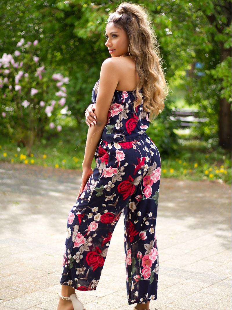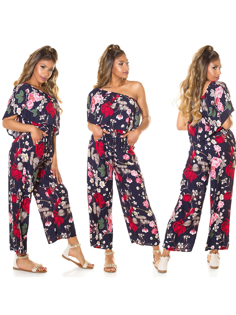 Az asszimetrikus női overál sötétkék alapon virágmintás, vékony, könnyű anyagból készült, amely ideális a nyári napokra. Gumis dereka kényelmes illeszkedést biztosít, asszimetrikus vállmegoldása pedig különleges, nőies megjelenést kölcsönöz. Laza szabása divatos és elegáns.